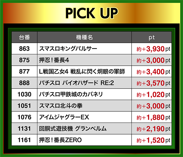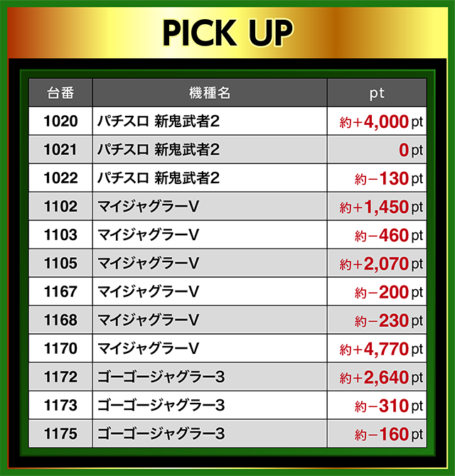 1170番台は約+4,770pt、1105番台も約+2,070ptと複数台が好結果を残した。