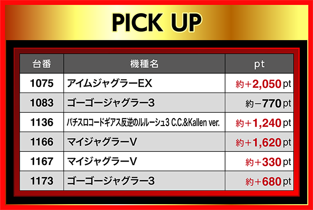ジャグラーシリーズも盛況で、『アイムジャグラーEX』の1075番台が約+2,000ptオーバー!