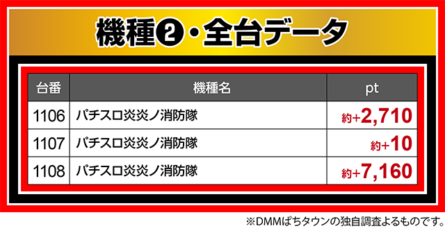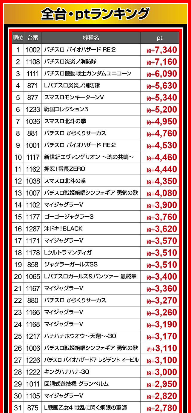 好調台は多く、『パチスロ機動戦士ガンダムユニコーン』の1111番台や『Lパチスロ炎炎ノ消防隊』の871番台なども約+5,000ptオーバー。