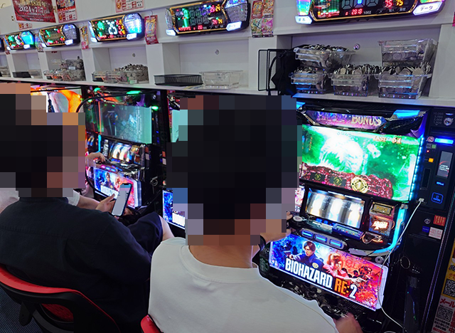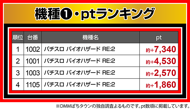 『パチスロ バイオハザード RE:2』の1001番台から1003番台までが連続で約+2,500pt超。