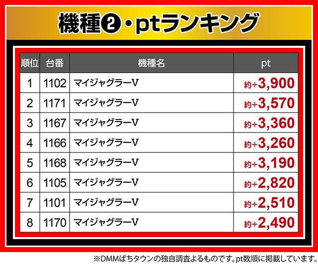 ボーナスタイプも盛況で、『マイジャグラーⅤ』の1102番台や『ゴーゴージャグラー3』の1177番台などが約+3,000ptを上回った。