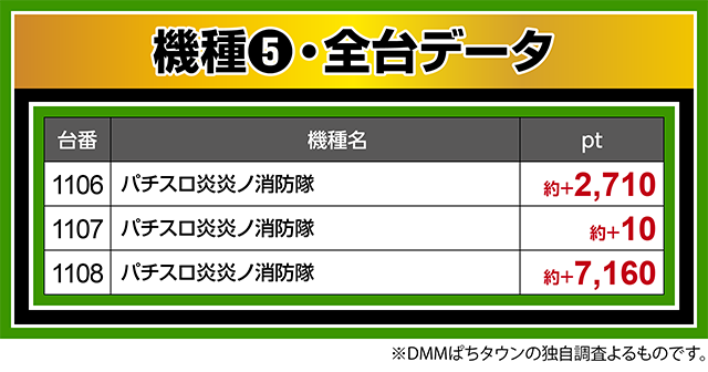 全台がプラスとなった機種は多く、『パチスロ炎炎ノ消防隊』の1108番台は約+7,160pt!!