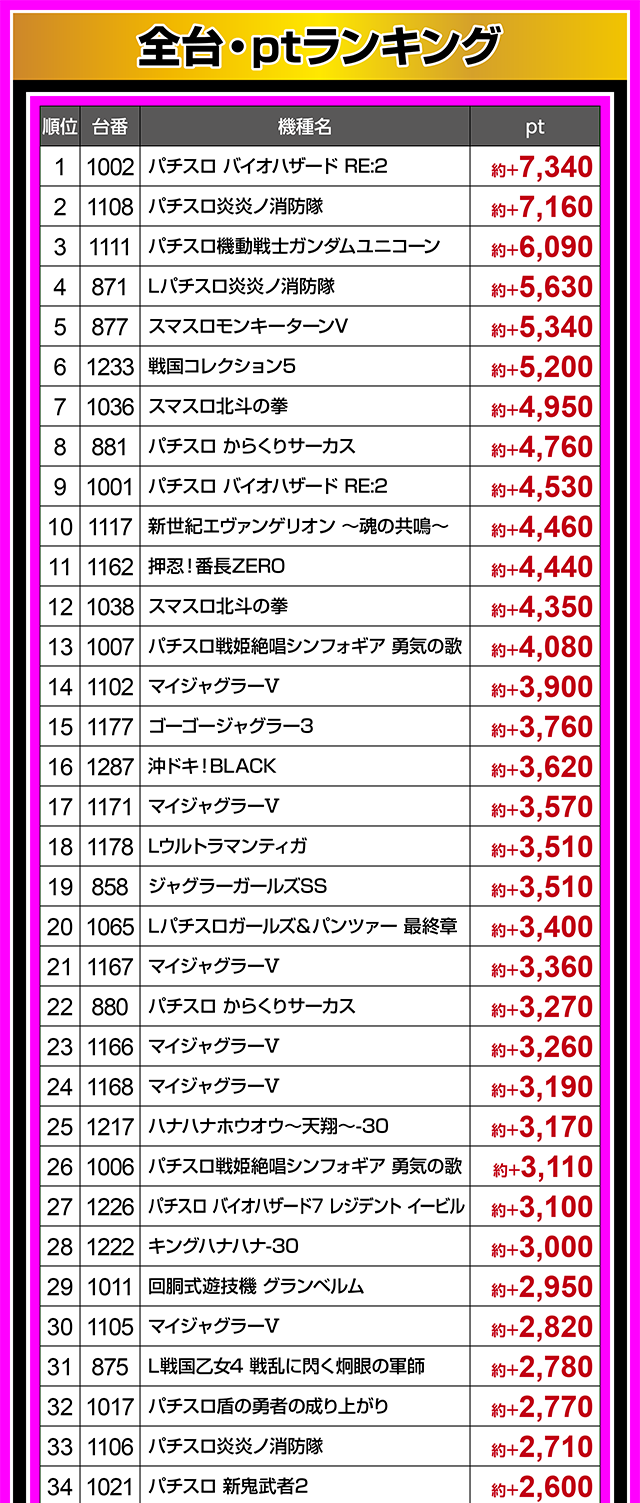 ほかにも、『Lパチスロ炎炎ノ消防隊』の871番台は約+5,630pt、『スマスロモンキーターンV』の877番台は約+5,340ptと、多くの台が結果を残した。