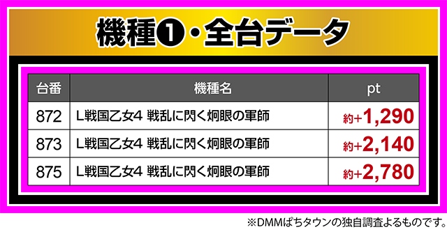 『L戦国乙女4 戦乱に閃く炯眼の軍師』も全台が約+1,200pt超と、機種全体が盛況。