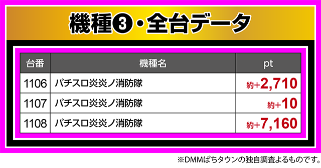 『パチスロ炎炎ノ消防隊』も全台がプラスで、1108番台は約+7,100ptを上回った。