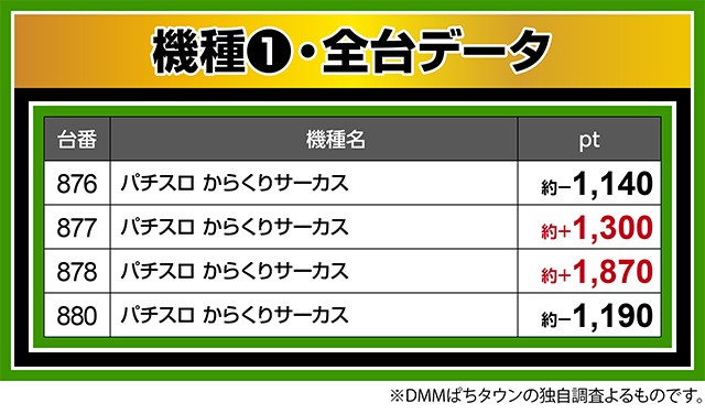 『パチスロ からくりサーカス』の877番台と878番台が並んで約+1,300pt以上!!