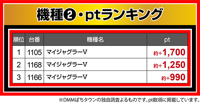 『マイジャグラーⅤ』も活気は大きく、1105番台が約+1,700pt。