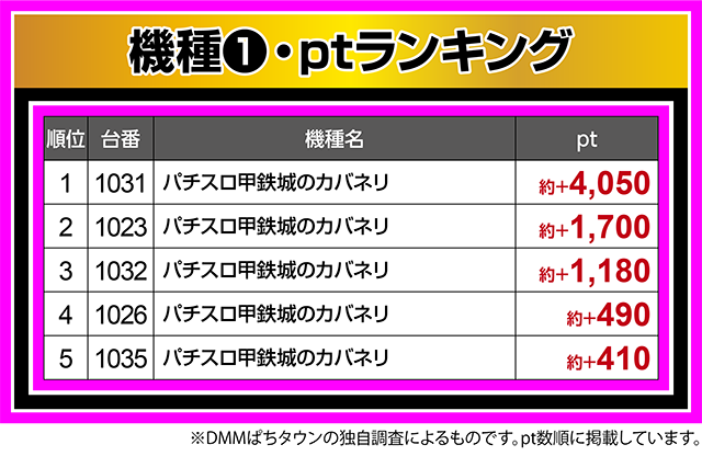 『パチスロ甲鉄城のカバネリ』では、1031番台が約+4,000ptを上回った。
