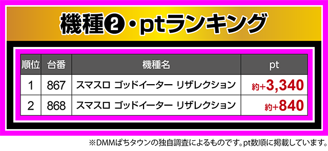 『スマスロ ゴッドイーター リザレクション』もプラスとなった台が複数あり、867番台は約+3,300ptを上回った。