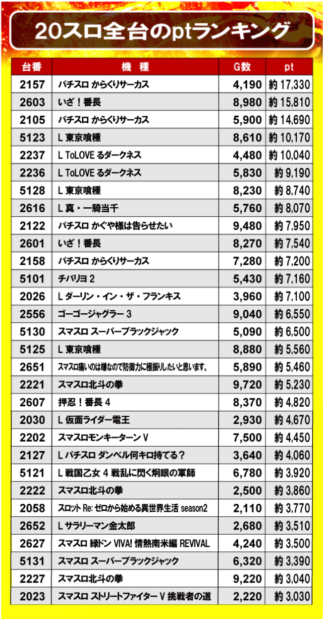 ①20スロ全台のptランキング