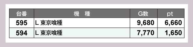 人気機種『L 東京喰種』の595番台が+6,660pt、『パチスロ かぐや様は告らせたい』の592番台が+6,570pt、593番台が+3,780ptと並んだ。他にも『スマスロモンキーターンV』589番台の+3,070pt、『スマスロ 緑ドン VIVA!情熱南米編 REVIVAL』396番台の+3,030ptなど、プレイヤーたちを満足させる結果がひしめき合っている。