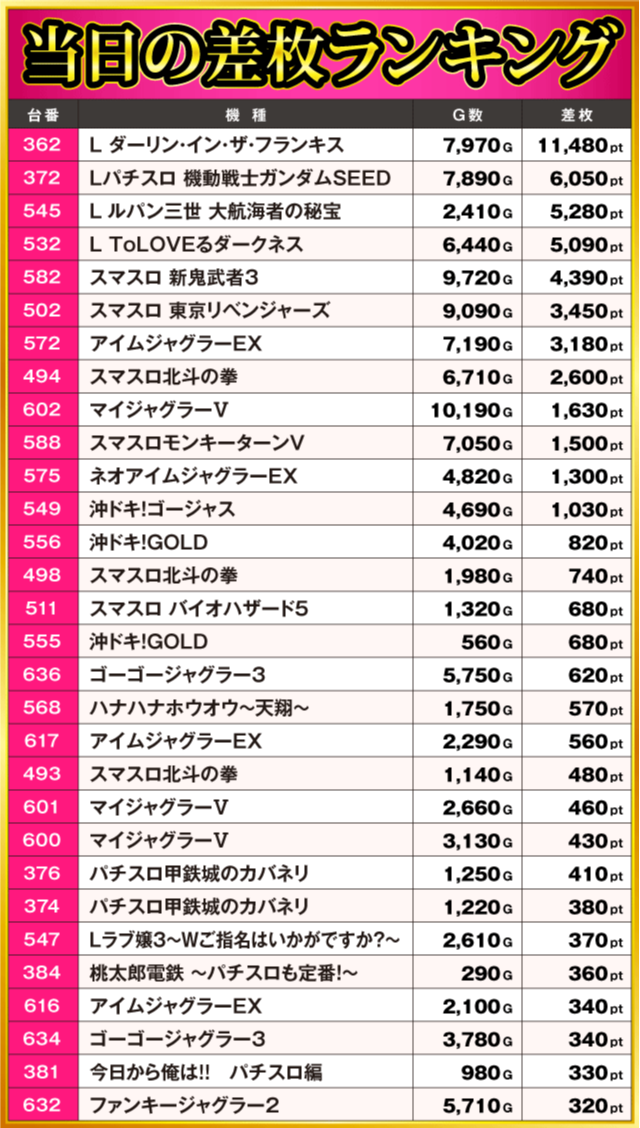 この日は、『L ダーリン・イン・ザ・フランキス』の362番台が万枚超の+11,480pt、『Lパチスロ 機動戦士ガンダムSEED』の372番台が+6,050ptを記録するなど、台番号の末尾が2の台からハイスコアが続出。最終的に、差枚TOP10に末尾2の台が7台もランクインしている点は注目すべきポイントと言えるだろう。