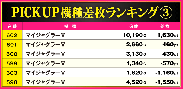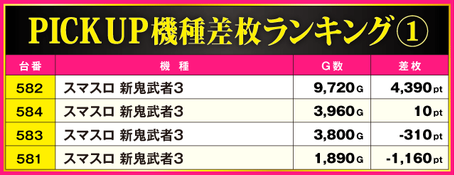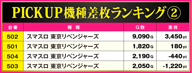 続いてPICK UP機種の状況をチェックしていくと、『スマスロ 新鬼武者3』から+4,390pt、『スマスロ 東京リベンジャーズ』から+3,450ptといった好成績を確認。さらに、各機種の差枚ナンバーワンも全て末尾2の台となっており、この日はとにかく「2」がアツい一日であった。