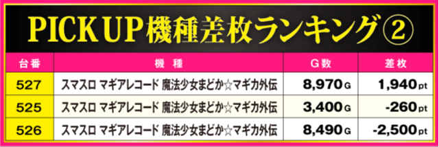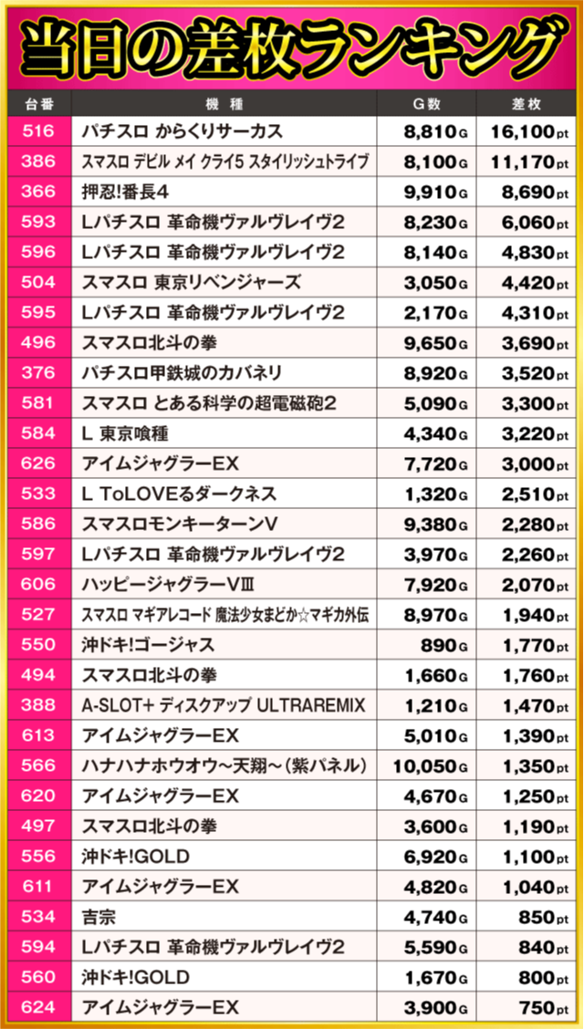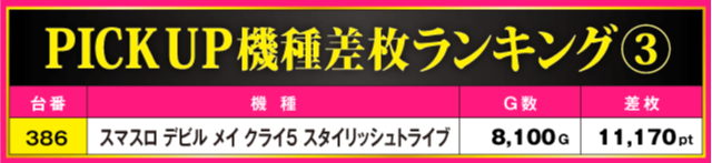 この日は、『パチスロ からくりサーカス』の516番台、『スマスロ デビル メイ クライ5 スタイリッシュトライブ』の386番台が万枚超を達成するなど、台番号の末尾が6の台からハイスコアが続出。最終的に、差枚TOP30に末尾6の台が11台もランクインしている点は要チェックポイントと言えるだろう。