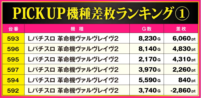 今回のPICK UP機種は全3機種。特に目立っていたのが話題の新台『Lパチスロ 革命機ヴァルヴレイヴ2』で、593番台の+6,060ptをはじめ+4,000pt超が2台も発生する盛況ぶりを披露している。しかも、全6台中5台がプラス差枚となっているだけに、ファンにとって充実の一日となったのは間違いないだろう。