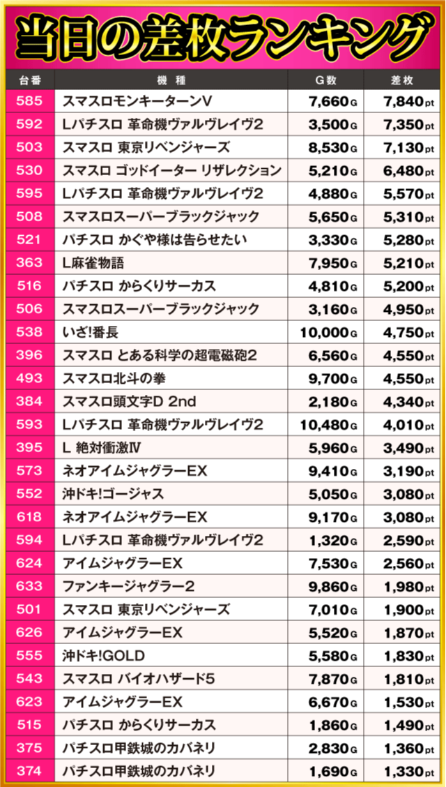この日は、『スマスロ 東京リベンジャーズ』の503番台が+7,130pt、『L麻雀物語』の363番台が+5,210ptを記録するなど、台番号の末尾が3の台からハイスコアが続出。最終的に、差枚TOP30に末尾3の台が8台もランクインしている点は注目すべきポイントと言えるだろう。