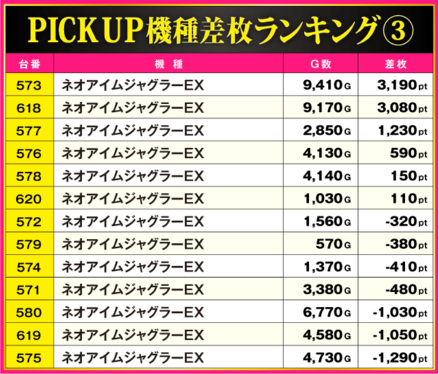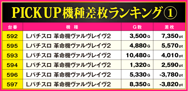 続いてPICK UP機種の状況をチェック!! 差枚上位にランクインした『スマスロ 東京リベンジャーズ』以外にも多数の好調台が確認されており、『Lパチスロ 革命機ヴァルヴレイヴ2』からは+7,350pt、『ネオアイムジャグラーEX』は+3,000pt超が2台発生。しかも、3機種合わせた全23台中13台がプラス差枚となる見事な結果を残している。