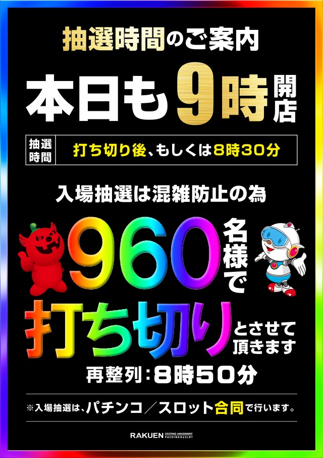 ①8:30~入場整理券の配布(お客様の人数により、早めさせて頂く場合が御座います。) ②8:50入場前の再整列(お客様の人数により、早めさせて頂く場合が御座います。) ③9:00~入場開始 |