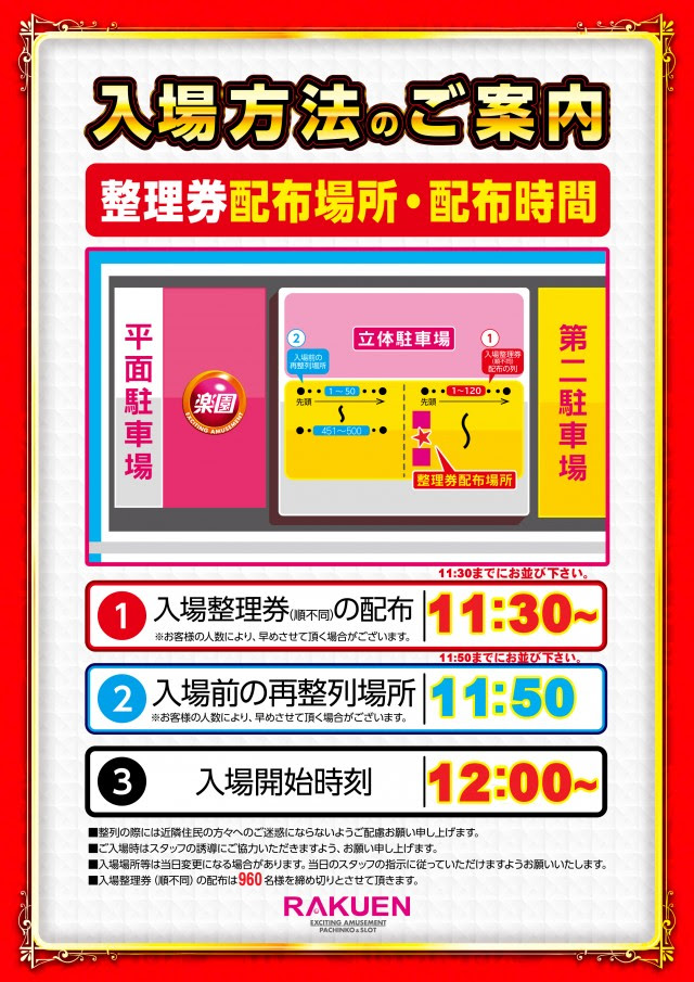 ①8:30~入場整理券の配布(お客様の人数により、早めさせて頂く場合が御座います。) ②8:50入場前の再整列(お客様の人数により、早めさせて頂く場合が御座います。) ③9:00~入場開始 |
