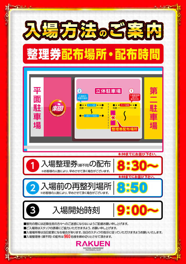 ①8:30~入場整理券の配布(お客様の人数により、早めさせて頂く場合が御座います。) ②8:50入場前の再整列(お客様の人数により、早めさせて頂く場合が御座います。) ③9:00~入場開始 |