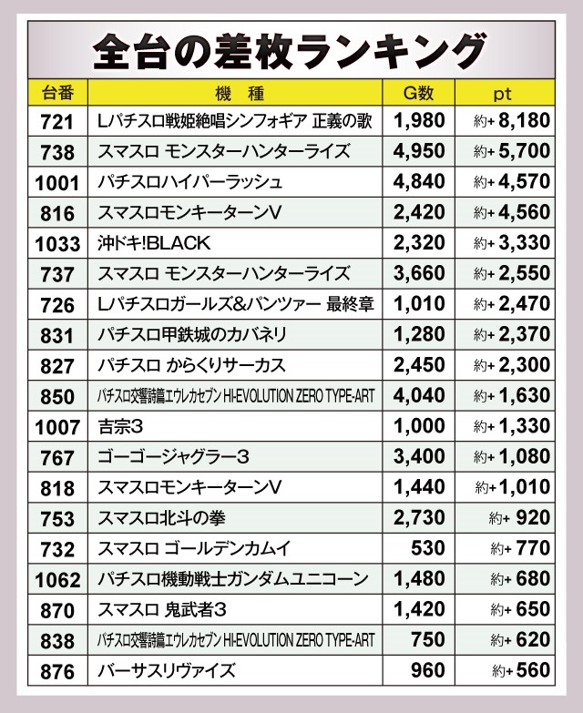 721番台『Lパチスロ戦姫絶唱シンフォギア 正義の歌』が8千pt超の好記録。さらに738番台の『スマスロ モンスターハンターライズ』も5千pt超の活躍を見せた。