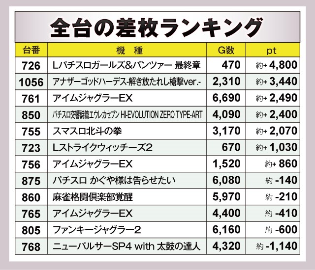 さらに761番台『アイムジャグラーEX』、850番台『パチスロ交響詩篇エウレカセブン HI-EVOLUTION ZERO TYPE-ART』、755番台『スマスロ北斗の拳』など、2千pt超の台をいくつも確認できた。