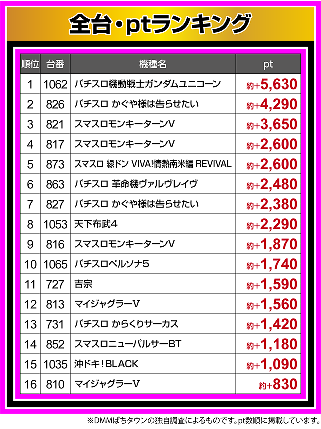 ほかにも、『パチスロペルソナ5』の1065番台や『吉宗』の727番台など、多くの台が約+1,000ptを上回った。