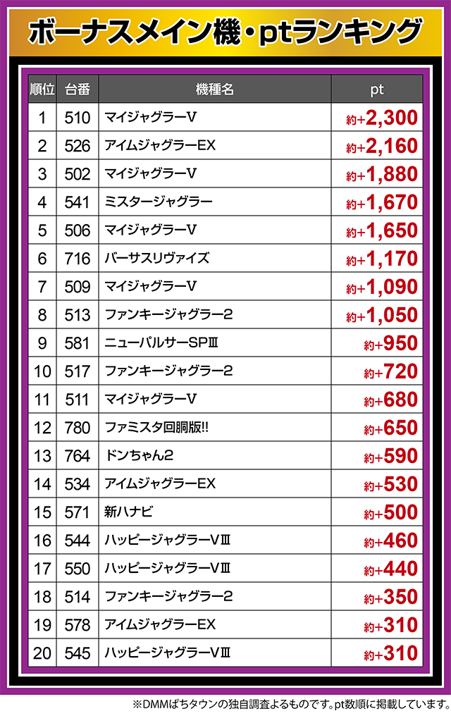 『ミスタージャグラー』の541番台や『ファンキージャグラー2』の513番台も約+1,000ptオーバーと、ジャグラーシリーズのいくつもの台が結果を残した。