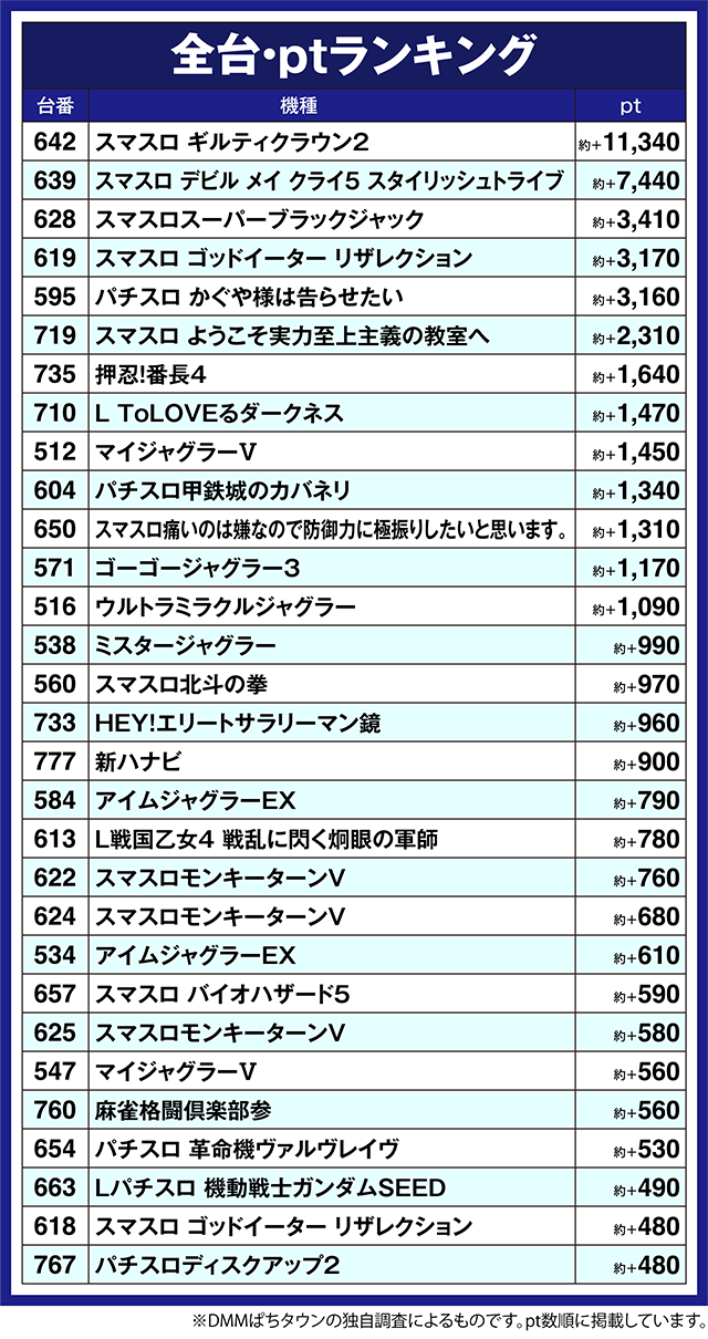 「スマスロスーパーブラックジャック」の628番台や「スマスロ ゴッドイーター リザレクション」の619番台、「パチスロ かぐや様は告らせたい」の595番台も約+3,100ptオーバー。