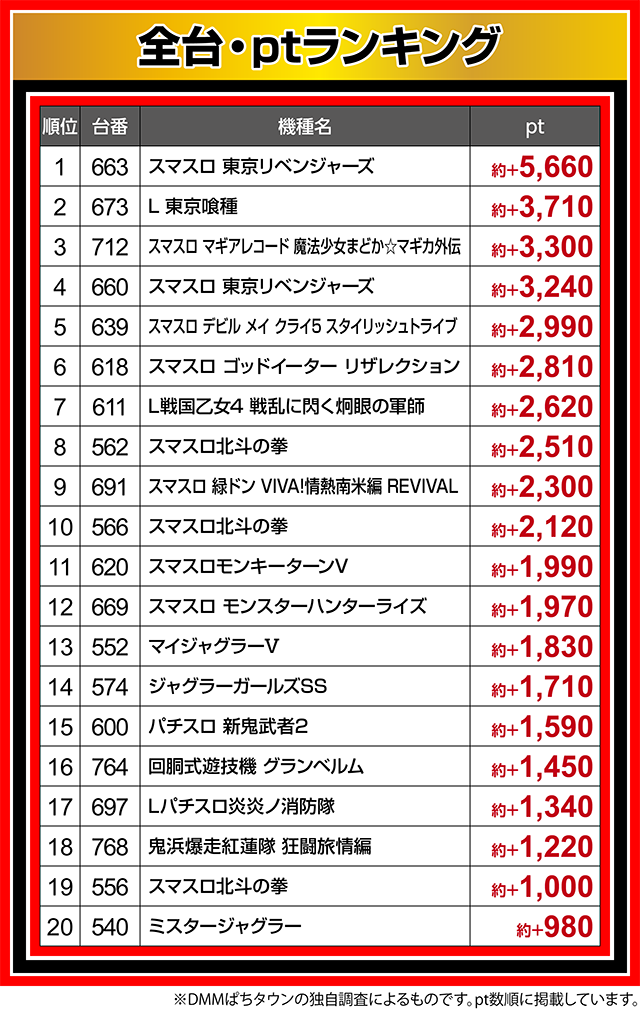 『L 東京喰種』の673番台や『スマスロ マギアレコード 魔法少女まどか☆マギカ外伝』の712番台も約+3,300pt以上を記録。