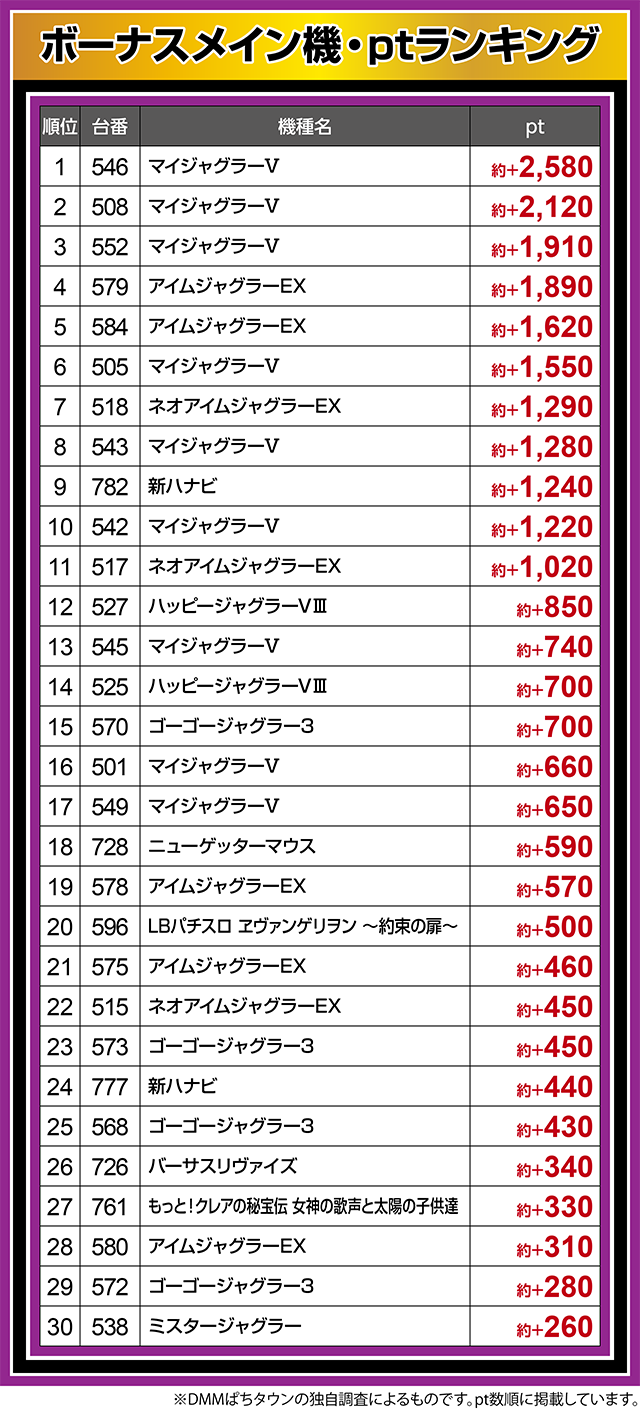 ほかにも、『ハッピージャグラーVⅢ』の527番台や『ゴーゴージャグラー3』の570番台など、いくつもの台がプラスとなった。