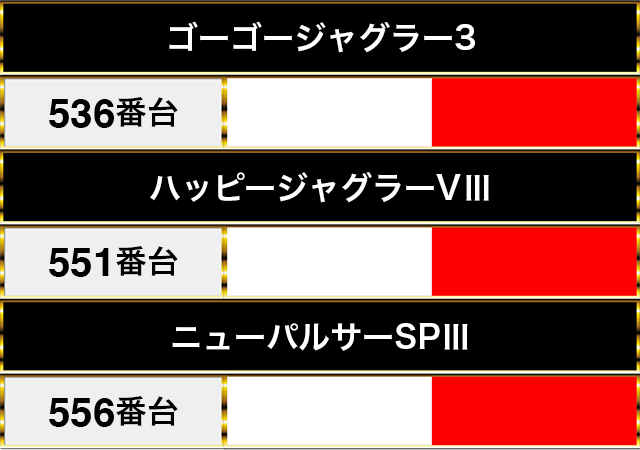 『ハッピージャグラーVⅢ』の551番台と『ニューパルサーSPⅢ』の556番台もプラスptでこの日を終えた。