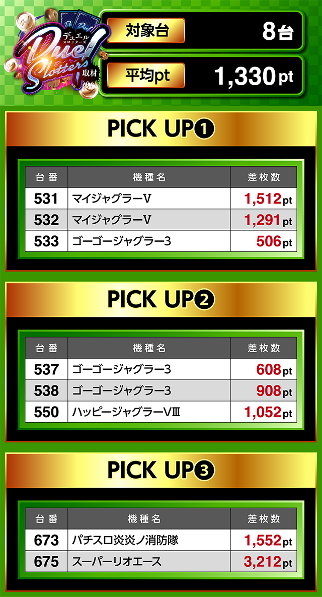 673番台の「パチスロ炎炎ノ消防隊」は1,500ptを超え、675番台の「スーパーリオエース」は3,200ptオーバー!!