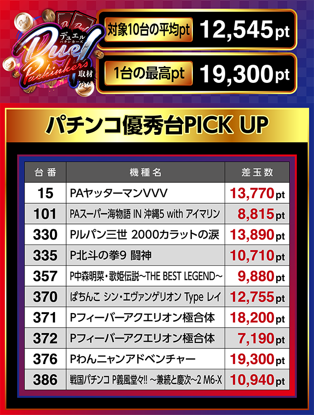 遊パチでも、15番台の「PAヤッターマンVVV」が13,000pt以上となった。