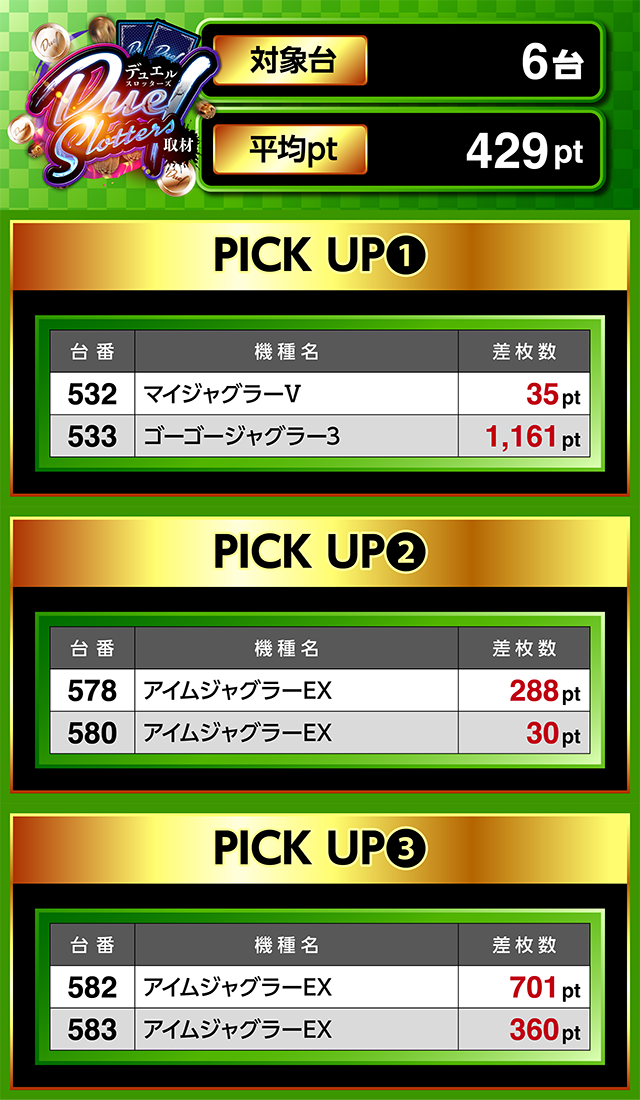 533番台の「ゴーゴージャグラー3」が1,161ptを記録。