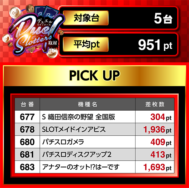 ほかにも、677番台の「S 織田信奈の野望 全国版」や680番台の「パチスロガメラ」、681番台の「パチスロディスクアップ2」が好結果を残した。