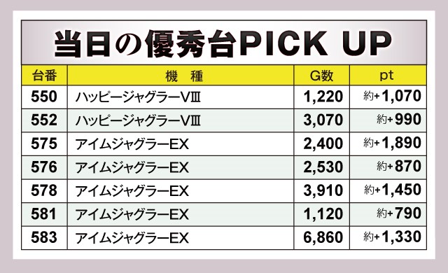 『ハッピージャグラーVⅢ』からは1台、『アイムジャグラーEX』からは3台も千pt超のポイントが飛び出していた。