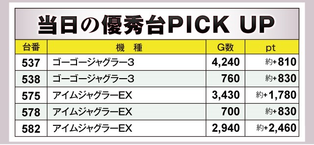 5台全台が好記録を打ち出しており、『アイムジャグラーEX』からは2千pt超のポイントが飛び出した。