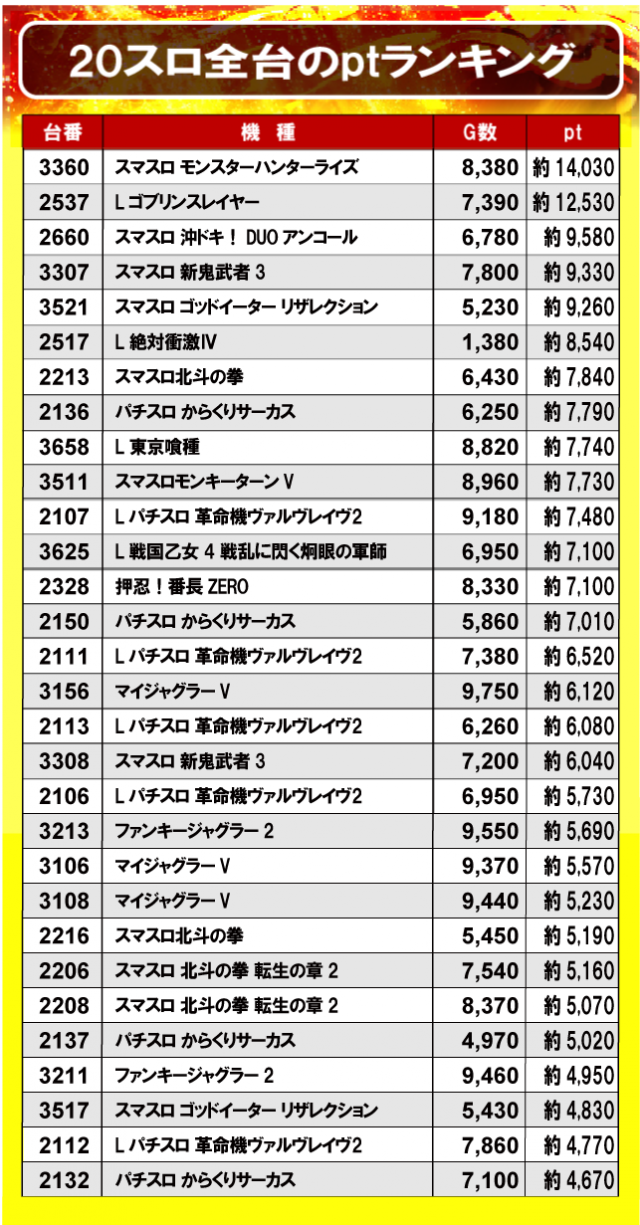 ①20スロ全台のptランキング