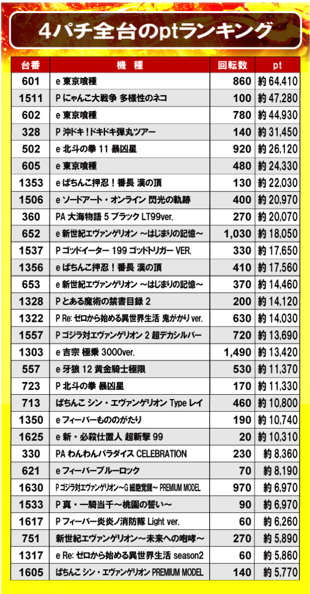 バラエティ豊かな機種がコンスタントに活躍し、その中でも人気機種『e 東京喰種』が約64,410ptを叩き出しランキングトップに!その他の機種も活躍しており、いずれも高い実力を発揮していたことから各所にチャンスは隠れていたようだ!
