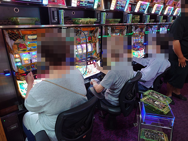 「沖ドキ!GOLD」で5箱以上、「パチスロ交響詩篇エウレカセブン HI-EVOLUTION ZERO TYPE-ART」では4箱以上の持ち玉で遊技をおこなっているプレイヤーを目撃。