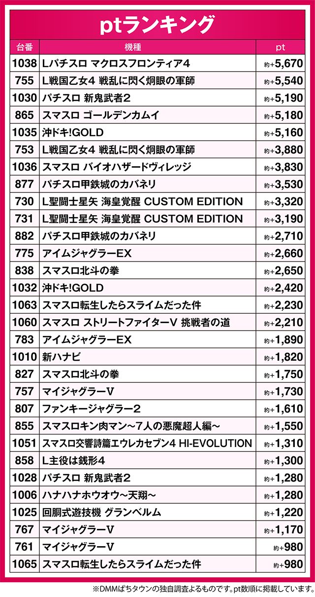 ほかにも、838番台の『スマスロ北斗の拳』が約+2,650pt、877番台の『パチスロ甲鉄城のカバネリ』が約+3,530ptと、優秀台が多数!
