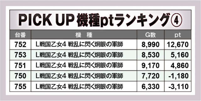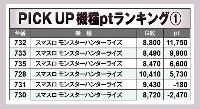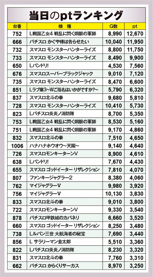 『L戦国乙女4 戦乱に閃く炯眼の軍師』『パチスロ かぐや様は告らせたい』にて万pt OVERが飛び出し、さらに『スマスロ モンスターハンターライズ』は万pt OVERと万枚未遂台を確認。他にも大台突破を果たした台が多く、ファンは大きな熱気に歓喜していたことだろう。その裏にある万回転OVER、さらには終日を通して打ち込まれた台の存在は、彼らがいかに手応えを感じていたのかを表している。