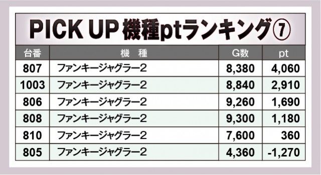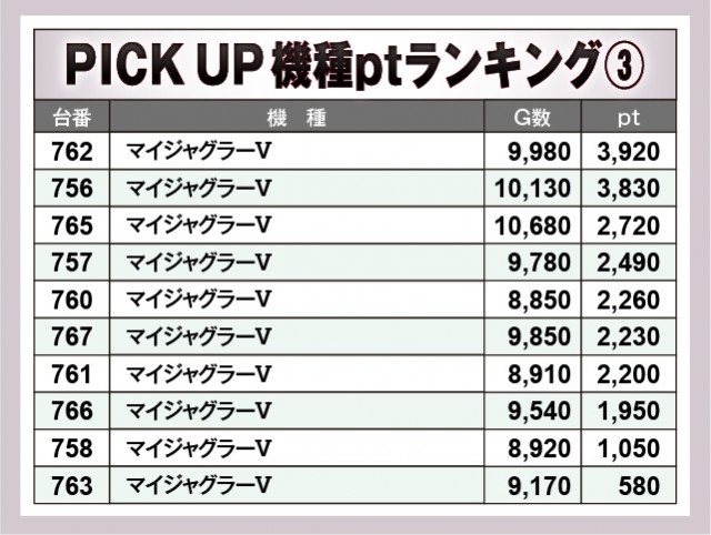 万pt OVERを達した3機種の存在感は言うまでもなく、優秀機種は大きな活気と熱気に包まれており、盛り上がりの中心地になっていた。その中で『パチスロ かぐや様は告らせたい』『Lバンドリ!』『スマスロスーパーブラックジャック』は全台プラスptを達成し、特に大きな存在感を放っていたと言えよう。『マイジャグラーⅤ』『ファンキージャグラー2』も右肩上がりのグラフを描き、ファンは安心感を覚えていたに違いない。