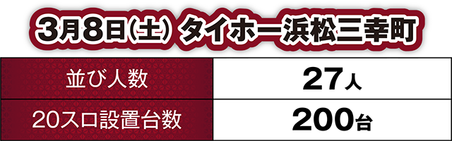 3月8日、大一番に挑んだホールは、「タイホー御殿場大坂」と「タイホー御殿場ぐみ沢」、「タイホー高丘」と「タイホー浜松三幸町」だ。