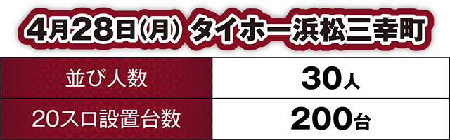 4月28日、大一番に挑んだホールは、「タイホー御殿場大坂」と「タイホー御殿場ぐみ沢」、「タイホー高丘」と「タイホー浜松三幸町」だ。