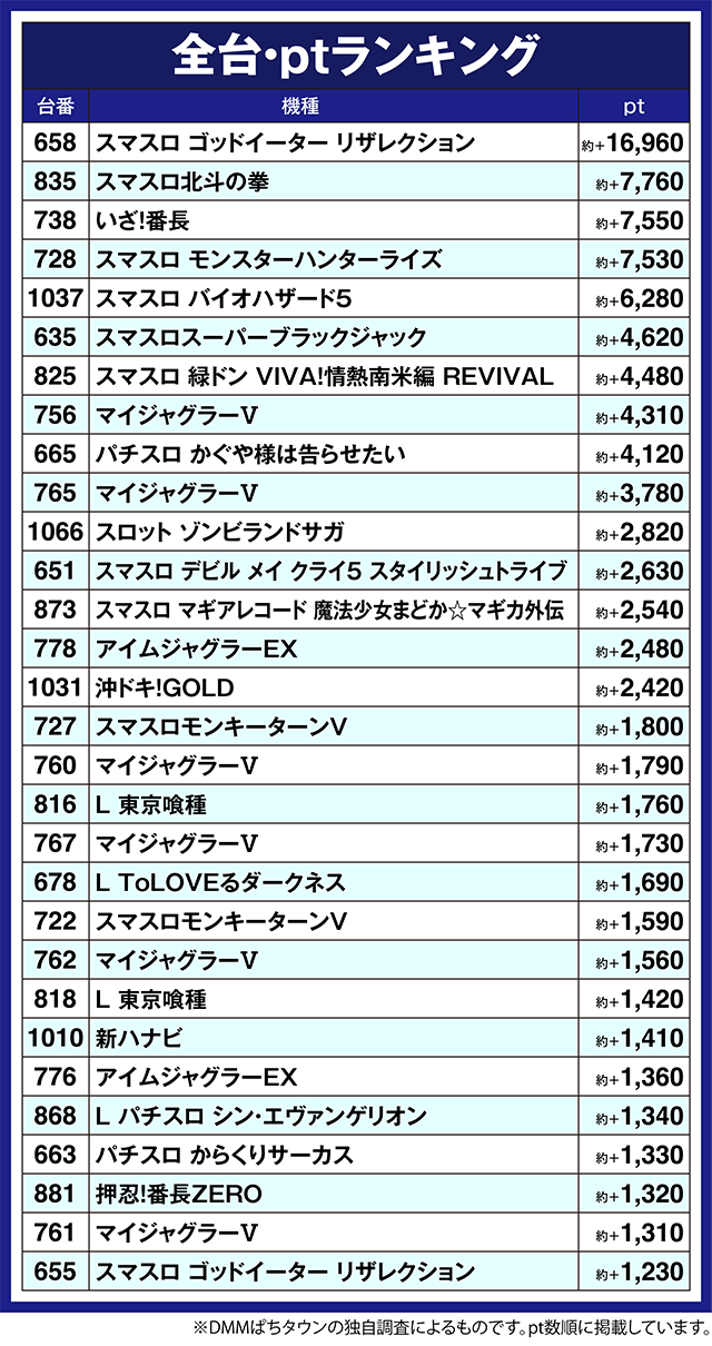 7台が約+1,000pt以上となり、約+4,300ptを超えた台もあった。
