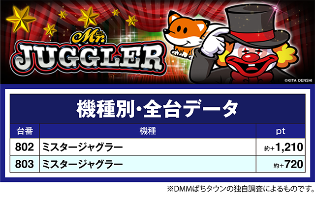 「ミスタージャグラー」は設置されている2台がともにプラスとなり、802番台は約+1,210ptを記録した。