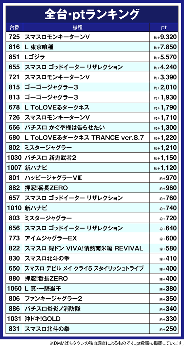 「L ToLOVEるダークネス」の678番台や「パチスロ かぐや様は告らせたい」の666番台も約+1,300pt以上と、多彩な機種が盛り上がりをみせた。