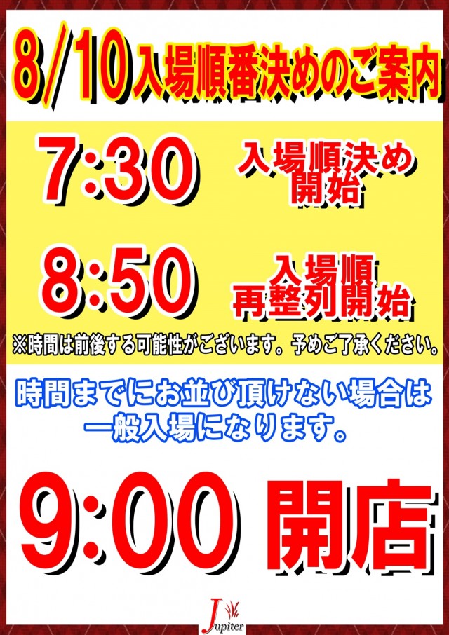 8:40より入場順番決め。8:50より再整列。9:00より入場。 |